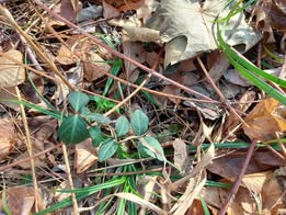 Wintercreeper, Euonymus fortunei, is easy to spot in the winter with its evergreen leaves. Wintercreeper likes to climb up tree trunks and then set fruit.